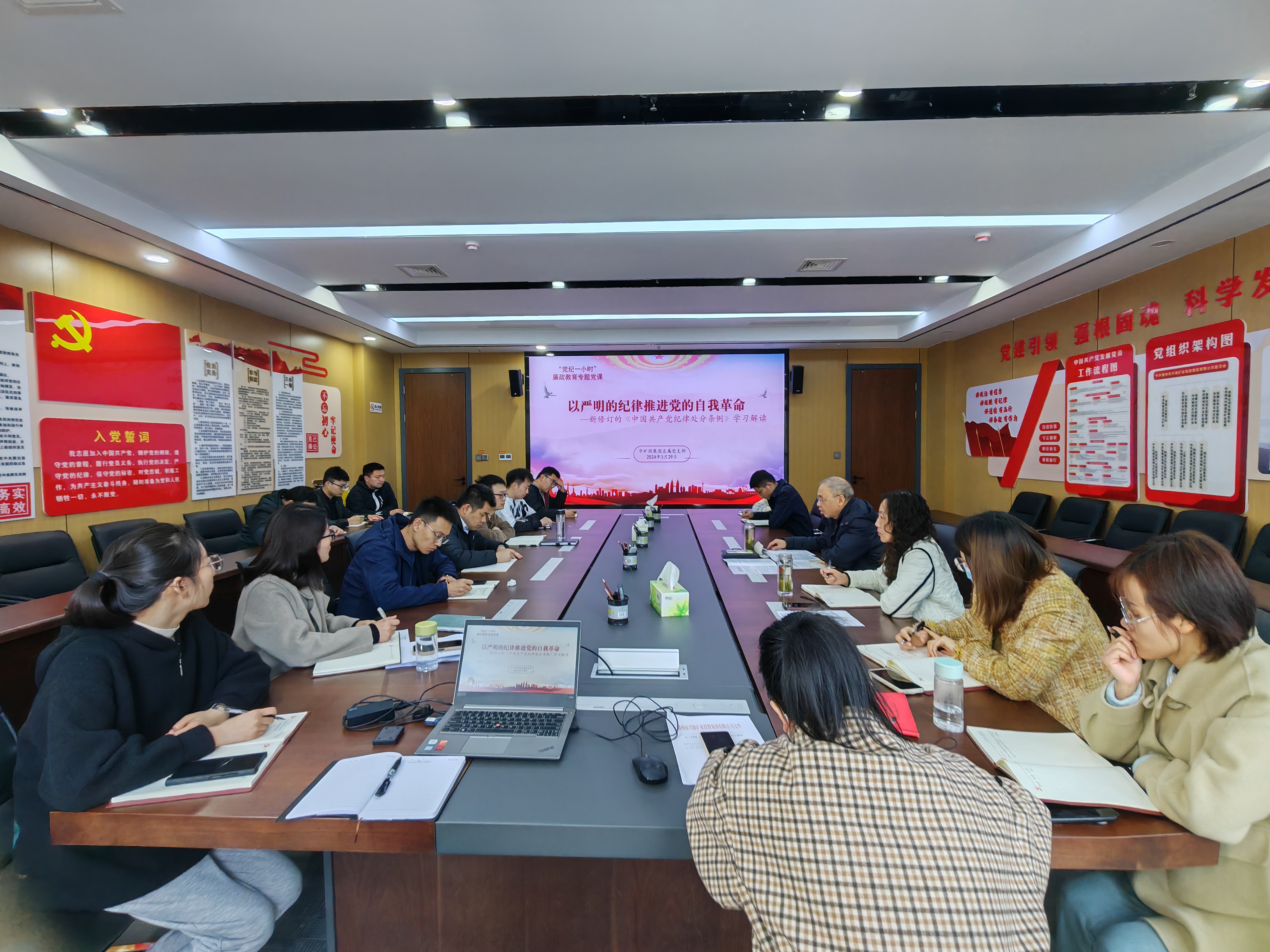 為進(jìn)一步學(xué)深悟透習(xí)近平總書記關(guān)于黨的自我革命的重要思想,推進(jìn)全面從嚴(yán)治黨向縱深發(fā)展,3月29日,市礦投集團(tuán)以學(xué)習(xí)貫徹新修訂的紀(jì)律處分條例為契機(jī),開展“黨紀(jì)一小時(shí)”宣講教育活動(dòng)。市礦投集團(tuán)黨委委員、駐市礦投集團(tuán)紀(jì)檢監(jiān)察組組長芮金保以“以嚴(yán)明的紀(jì)律推進(jìn)黨的自我革命“為題,圍繞學(xué)習(xí)解讀新修訂《中國共產(chǎn)黨紀(jì)律處分條例》進(jìn)行宣講。