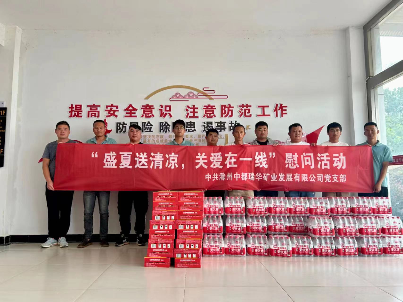 入伏以來,氣溫連續(xù)攀升。為關(guān)心一線員工身心健康,體現(xiàn)黨組織溫暖,7月28日,中都瑞華礦業(yè)黨支部組織為項目一線職工以及鄔崗、林山兩個運輸車隊送上防暑降溫物品。對他們冒著酷暑仍堅持在一線奮力工作的精神表示感謝,并叮囑他們要做好防暑工作,確保安全生產(chǎn)。